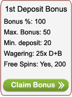 - 1st deposit = 100% bonus up to €50 plus 200 free spins on Starburst (which you receive over 10 days with 20 spins a day)