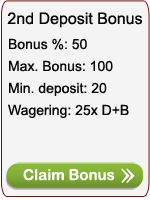 - 2nd deposit = 50% bonus up to €100